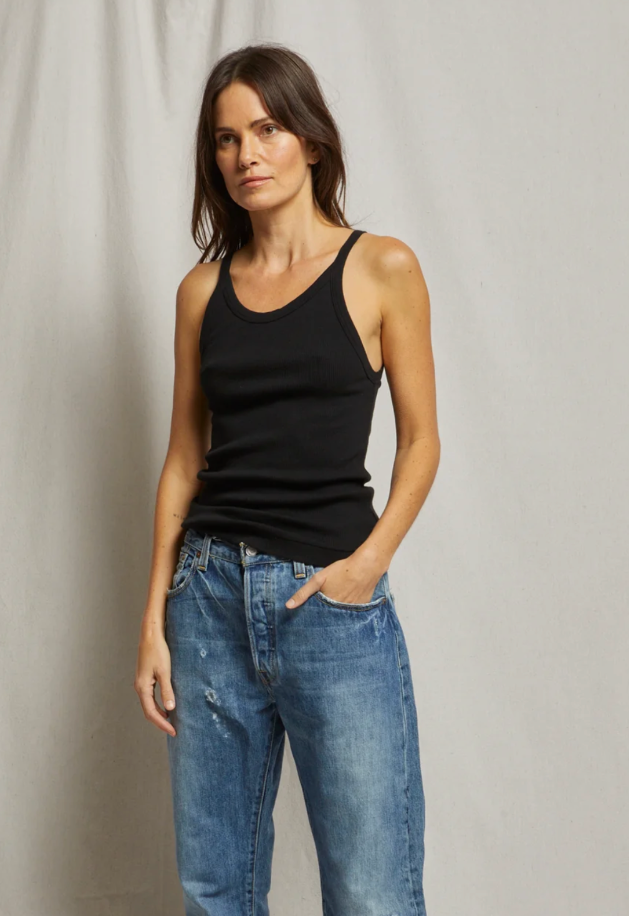The Annie ribbed tank features a high neck and form fitting body. perfect on its own or layer in the colder months.