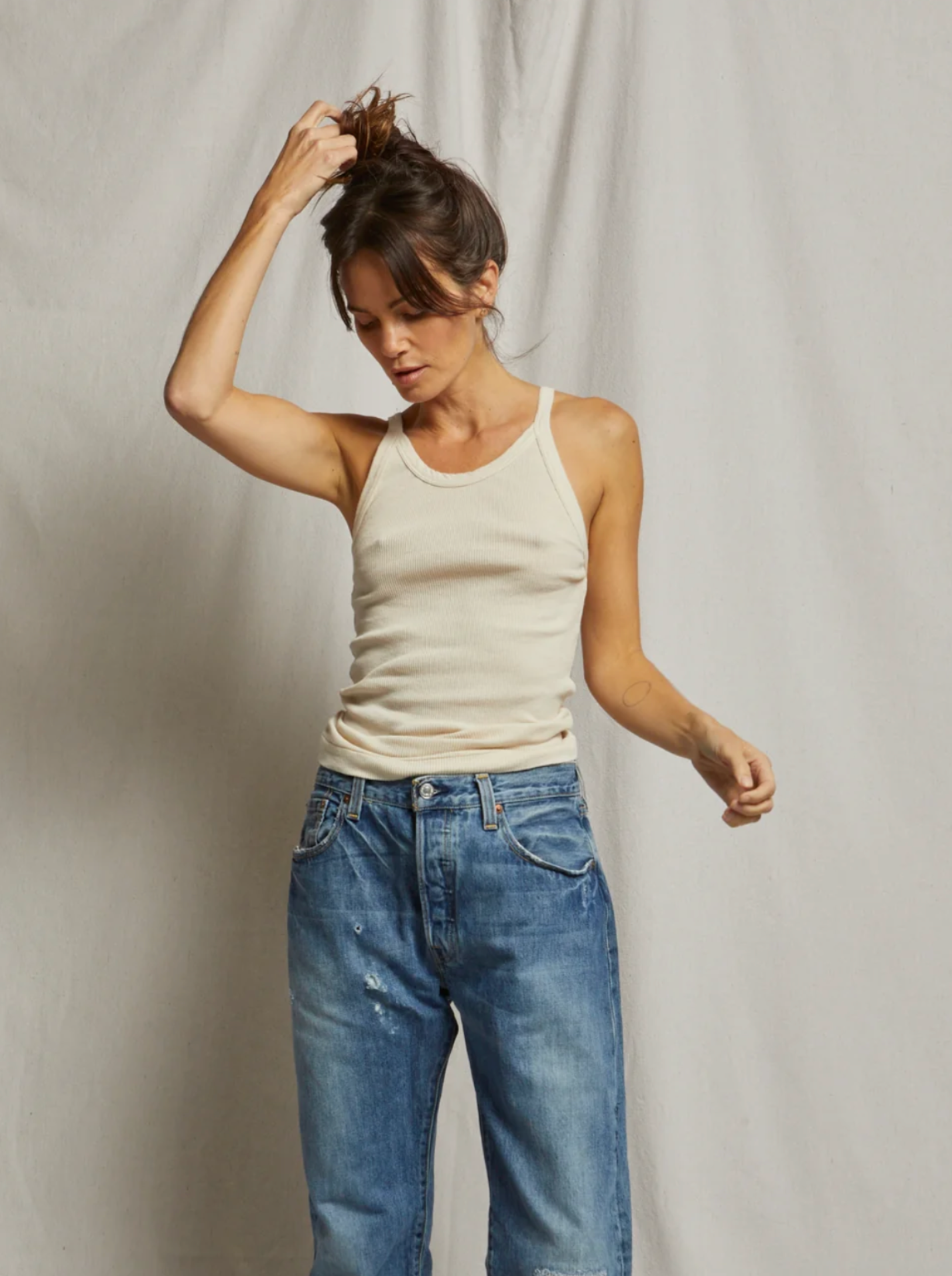 The Annie ribbed tank features a high neck and form fitting body. perfect on its own or layer in the colder months.
