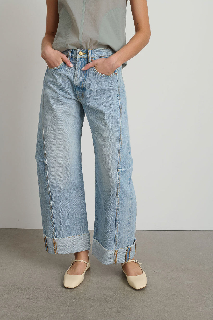 Relaxed Lasso cuffed jean is cut from heavy cotton rich denim then finished for a relaxed structured look. Designed to sit at the natural waist with a pieced outer seam, kinked leg shape, long length and flat-felled finishing. The raw hemline may be worn long or cuffed.