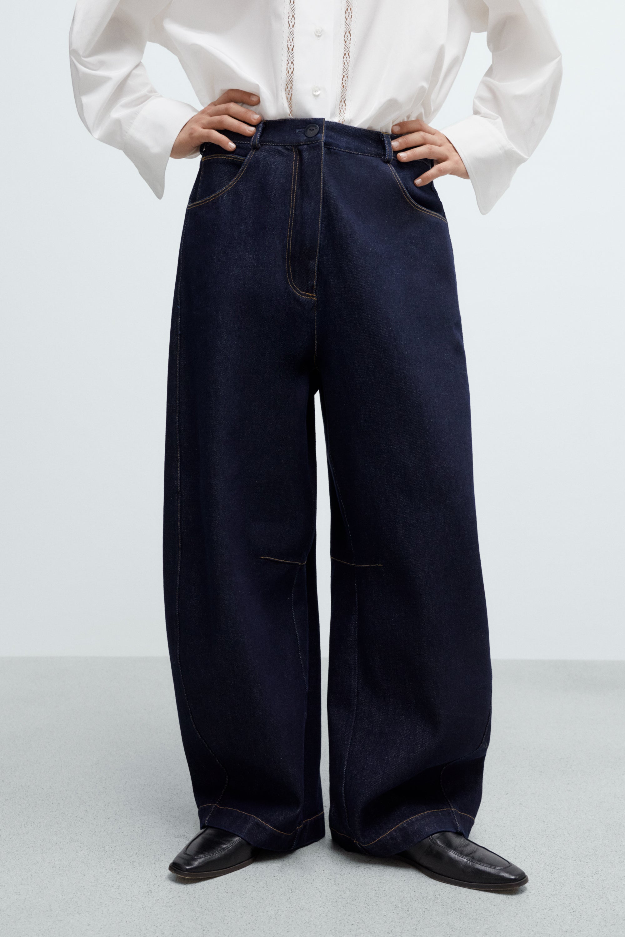 These curved baggy jeans feature a dark denim wash with contrasting stitching for a classic yet distinctive look. Designed with an oversized fit and low rise, they offer relaxed comfort and style. The traditional five-pocket design includes three front and two back pockets, complemented by belt loops for versatility. A unique internal knee seam adds subtle detail. Made from soft, substantial cotton fabric, these jeans provide ease of movement with a comfortable, non-rigid feel.