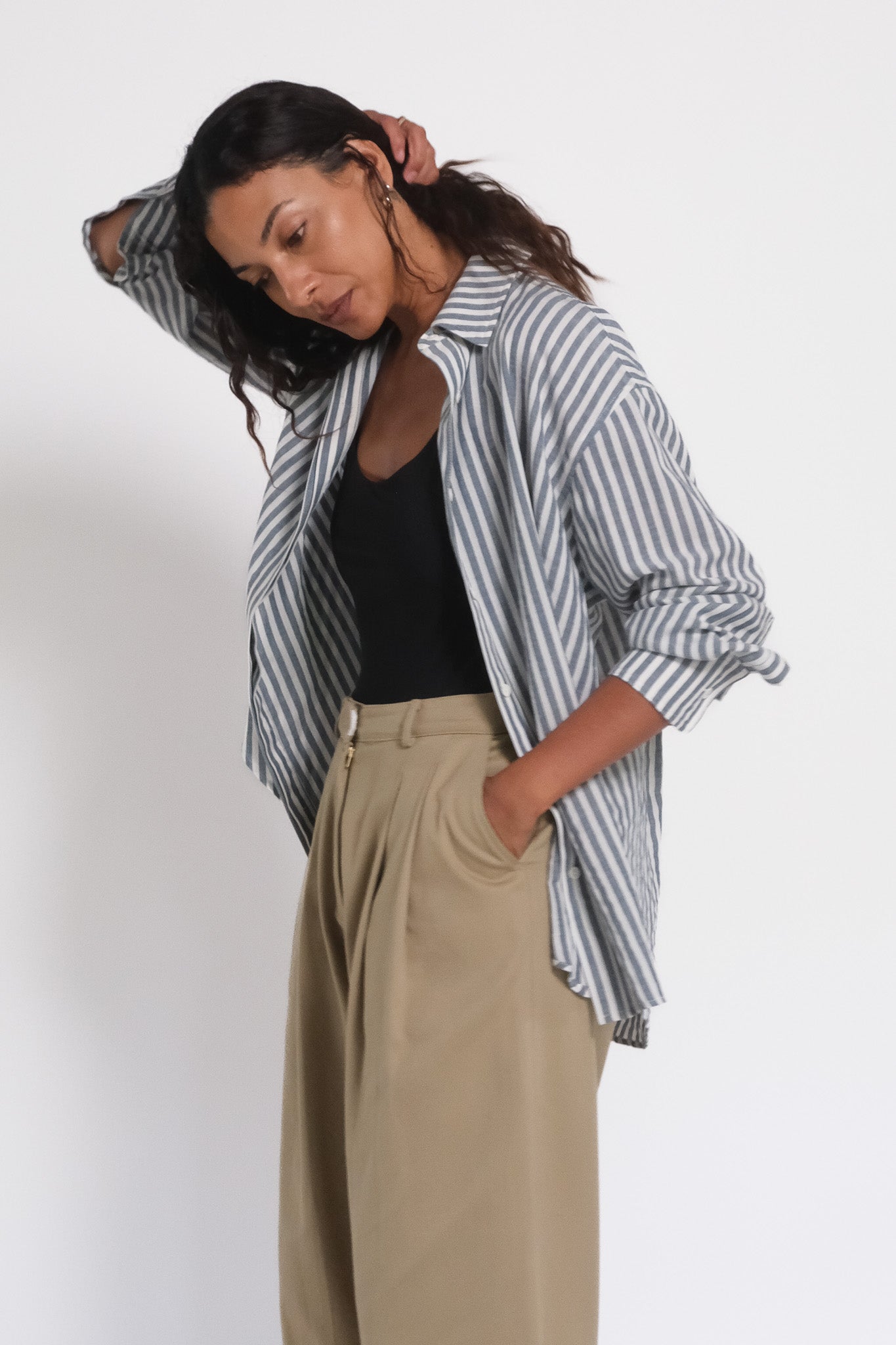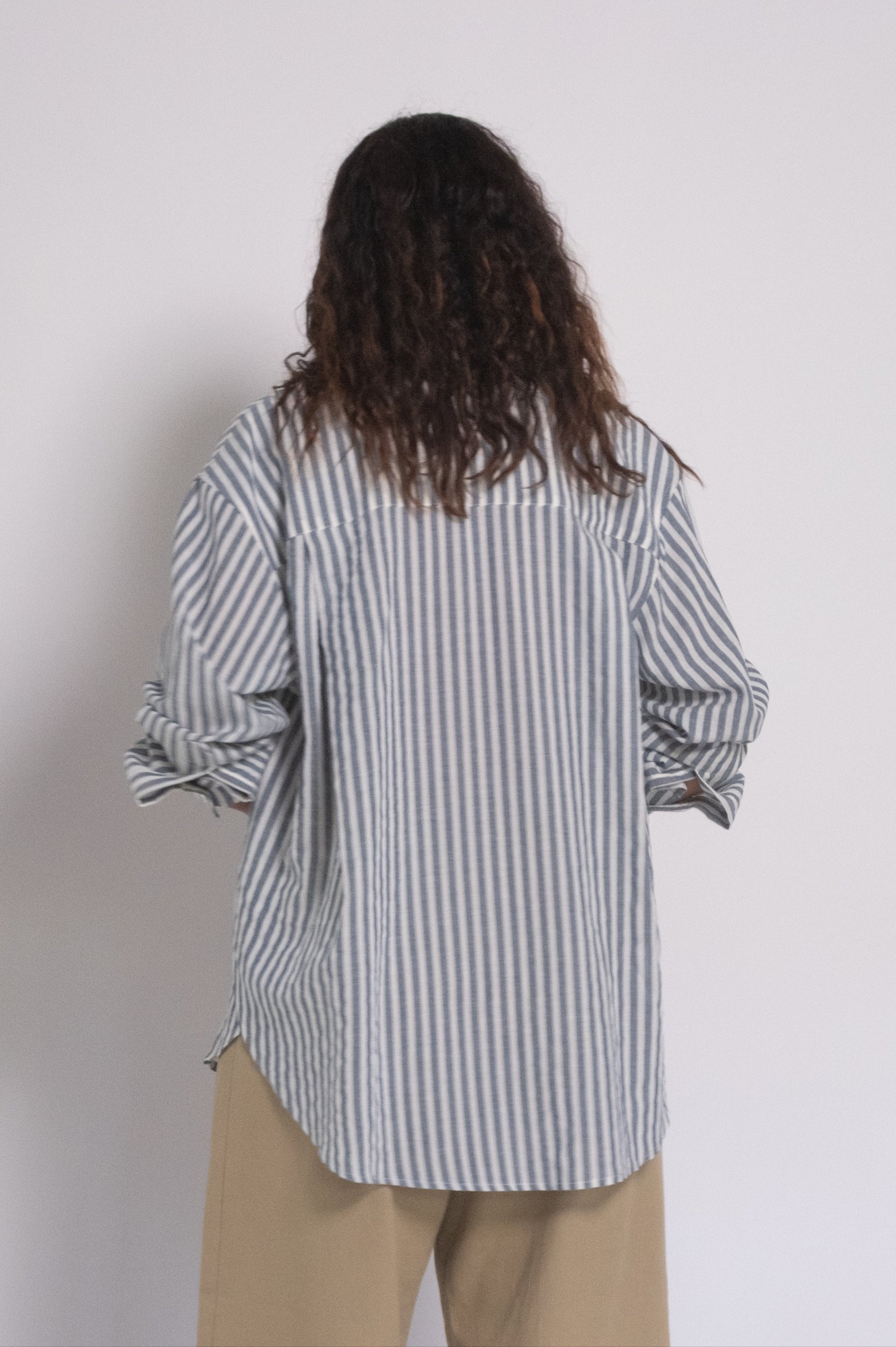 Designed for a relaxed fit, this shirt features a classic collar and concealed front button closure. Extended back yoke with double back pleat. Gently oversized with rounded hem detail, neat single button cuffs.