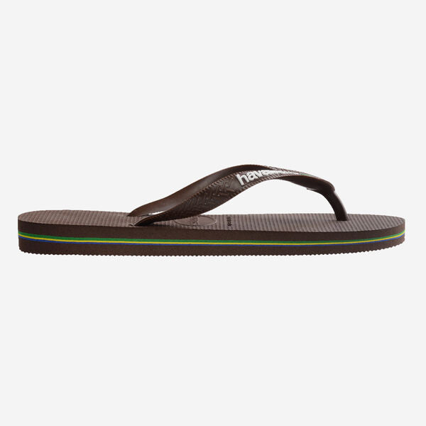 The Brazil Thongs in cafe brown, features the signature havaianas Brazil flag and stripe around the sole.