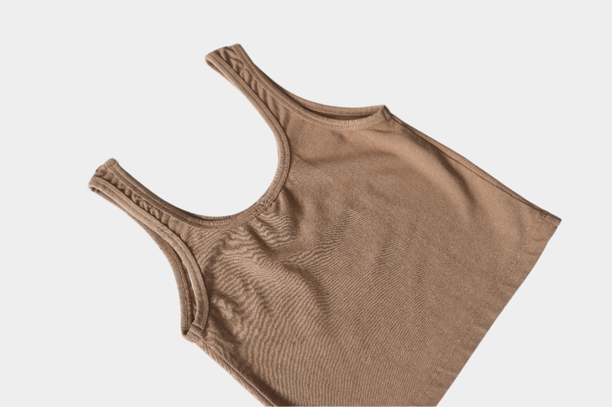 Wide, sturdy straps with a gentle scoop neck, and fitted shape.