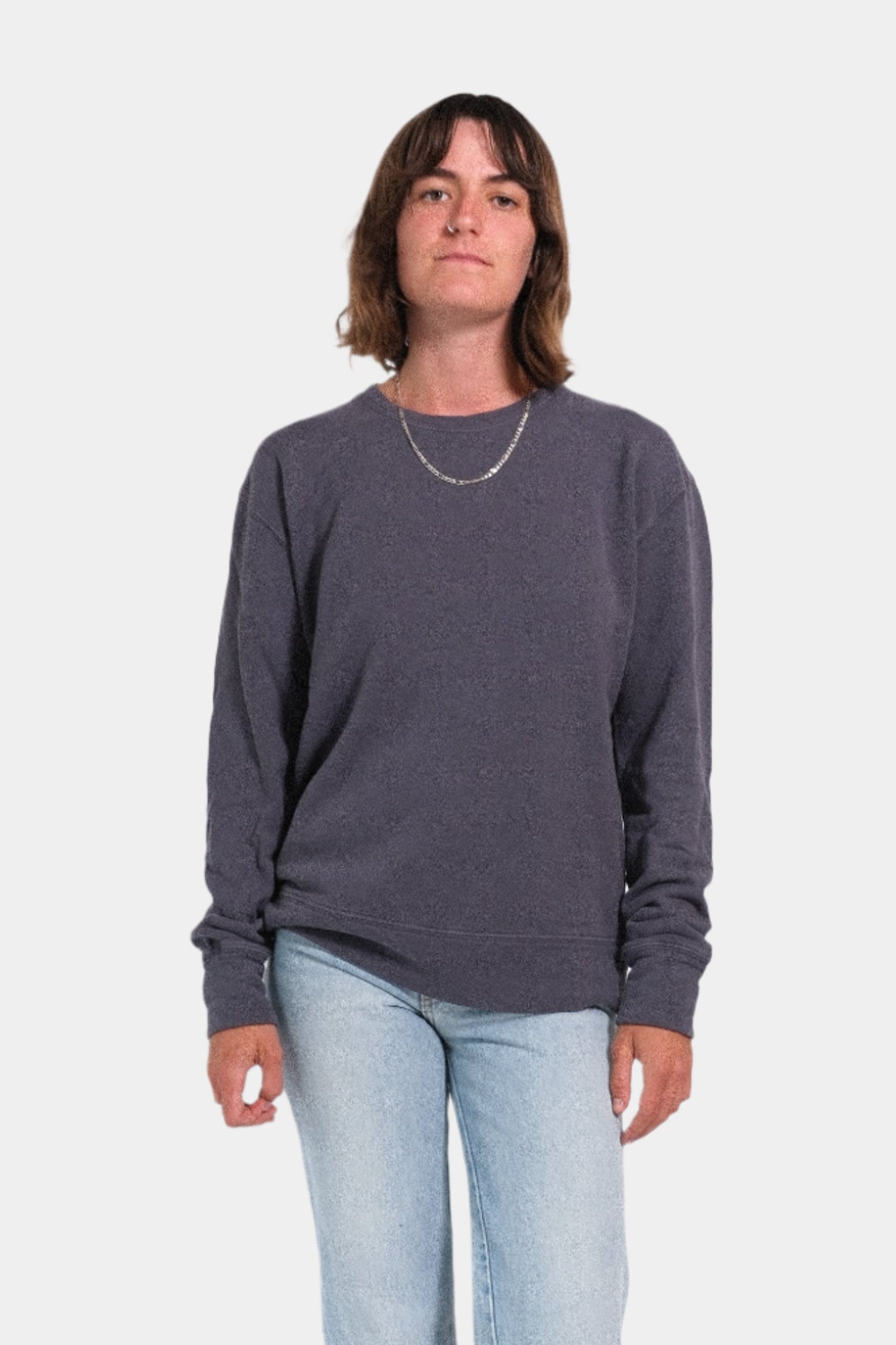 Easy fit with slightly dropped shoulder seam crew neck.