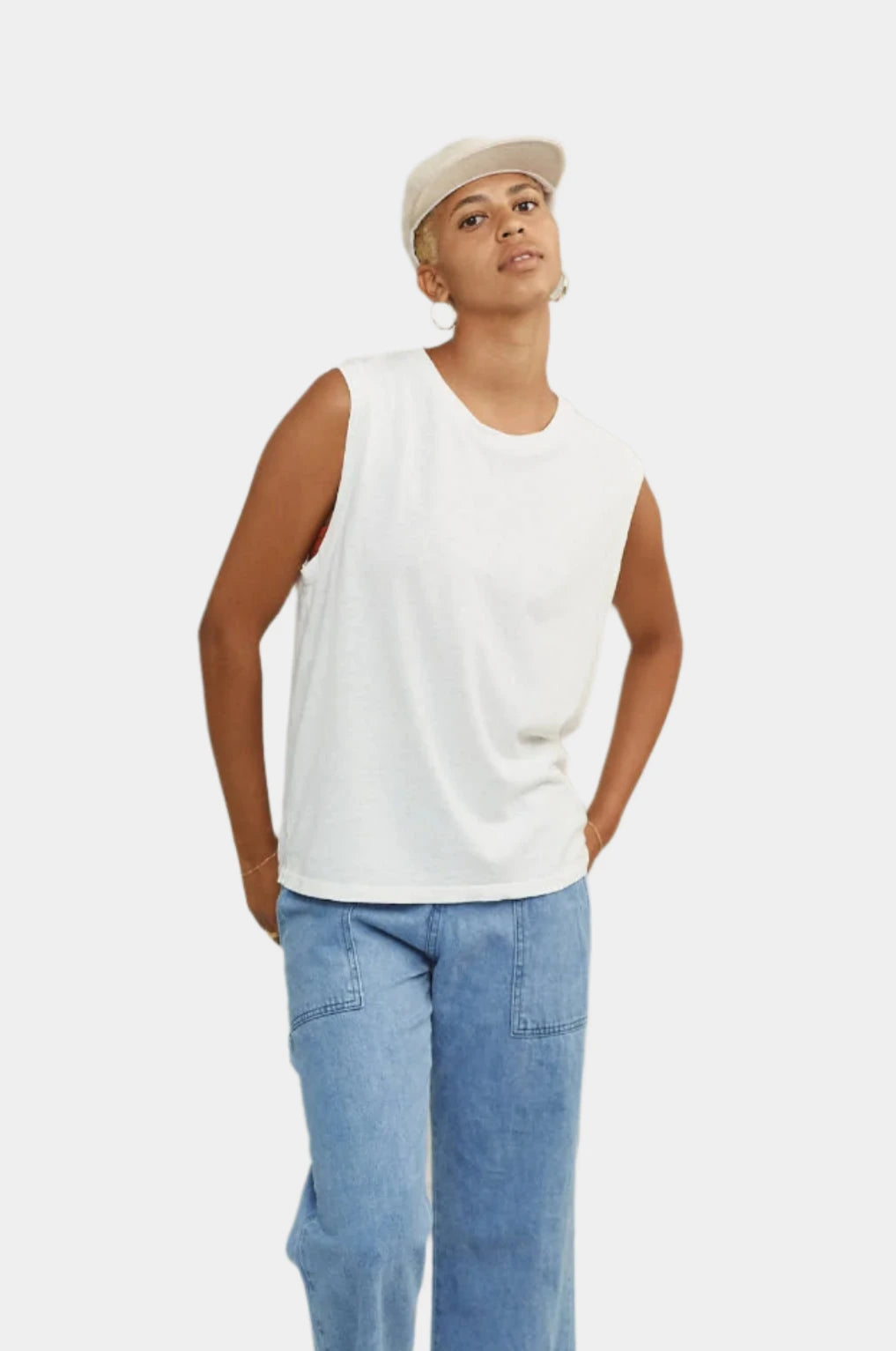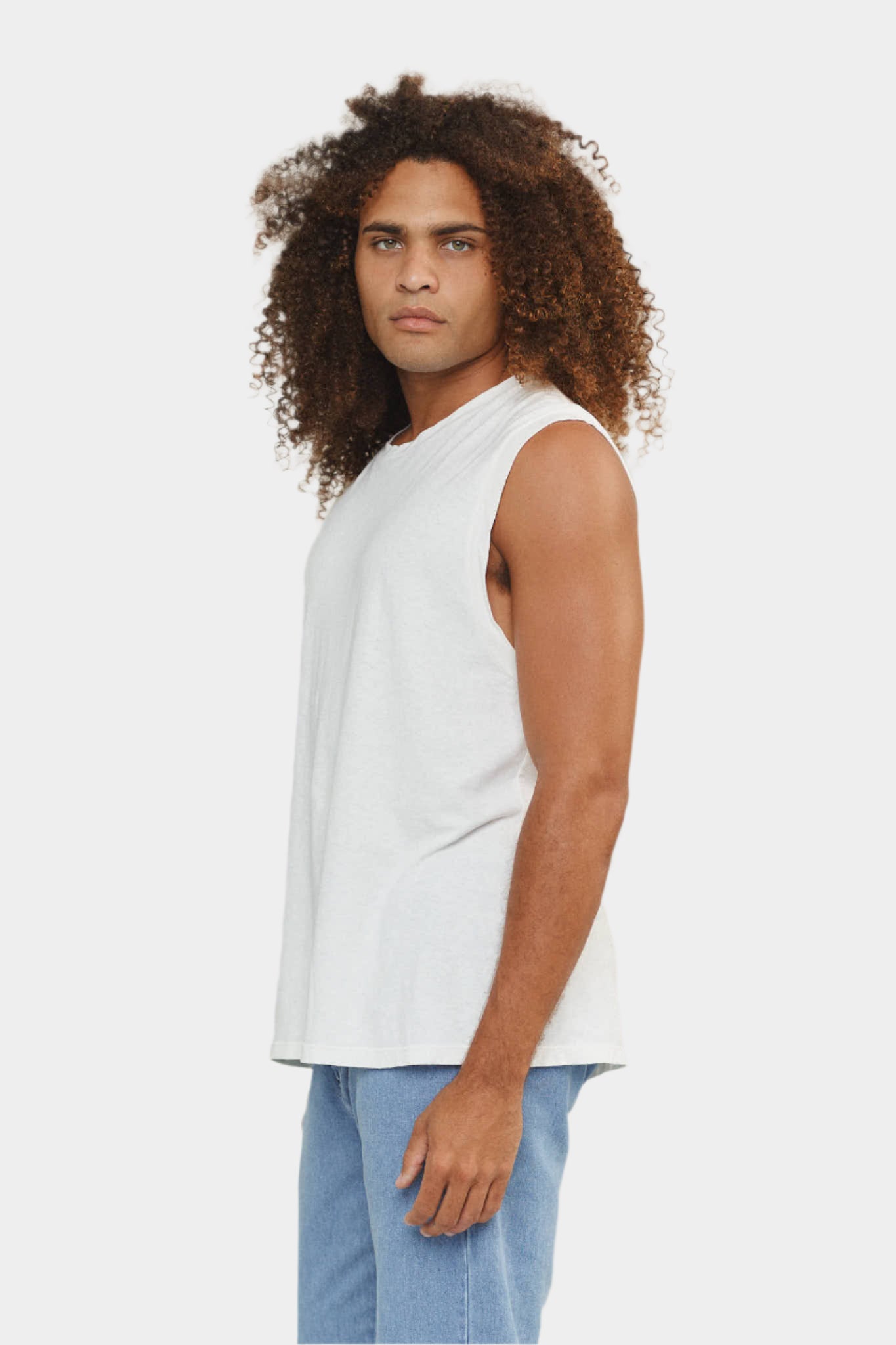 The Malibu Muscle Tee - Washed White, is a Light-weight, iconic shape with a relaxed fit. Built from a special hemp blend that's breathable and has a subtle texture; feels like vintage.