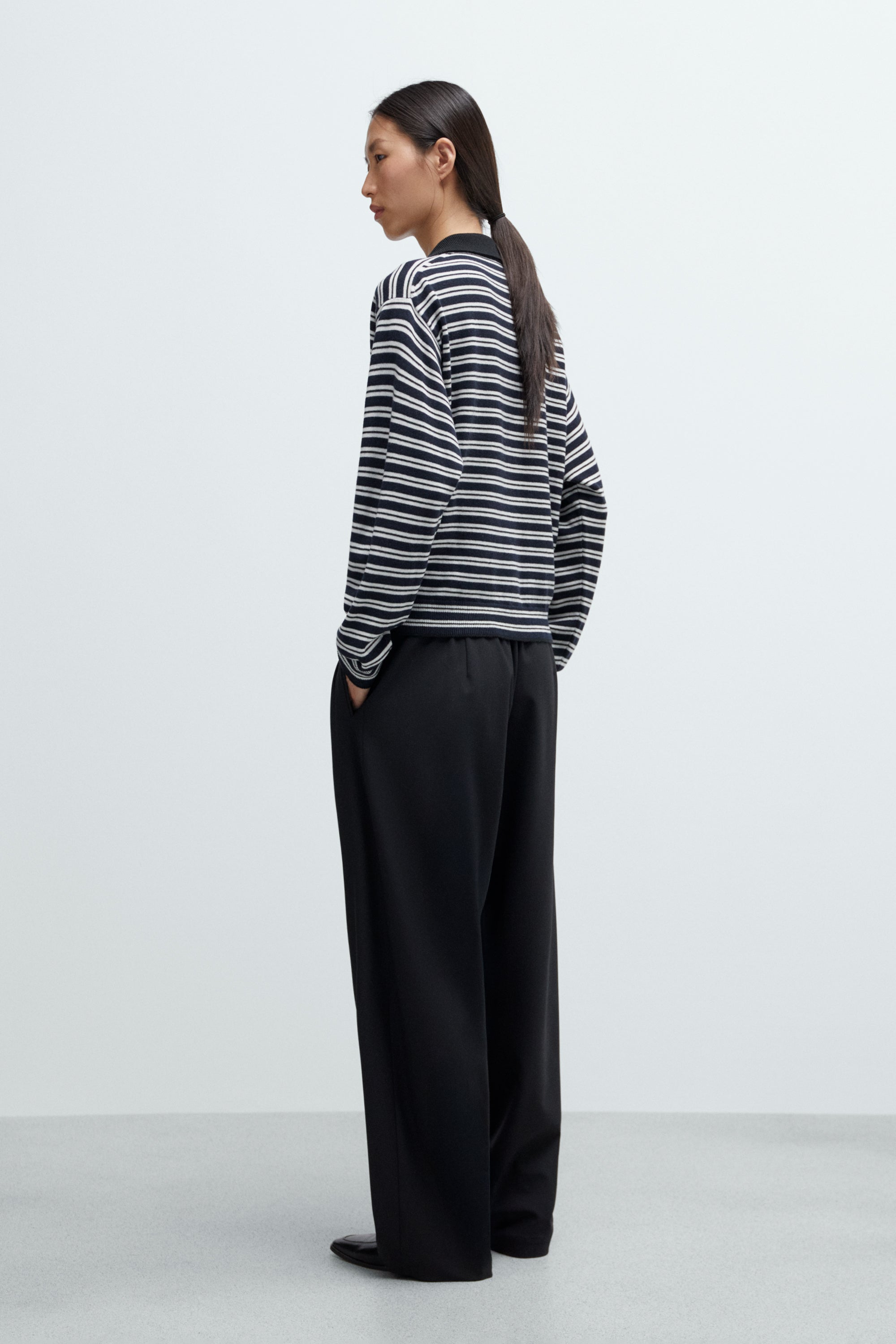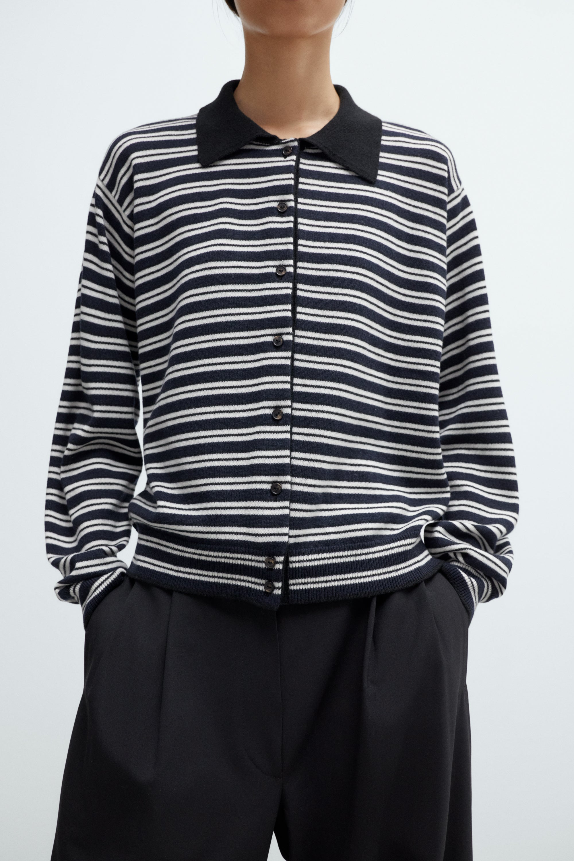 This long-sleeve polo cardigan showcases a regular fit and a classic striped pattern in navy, white, and black. It features a contrasting black polo collar and a full row of small buttons down the front. Ribbed cuffs and hem add structure and comfort to the silhouette.