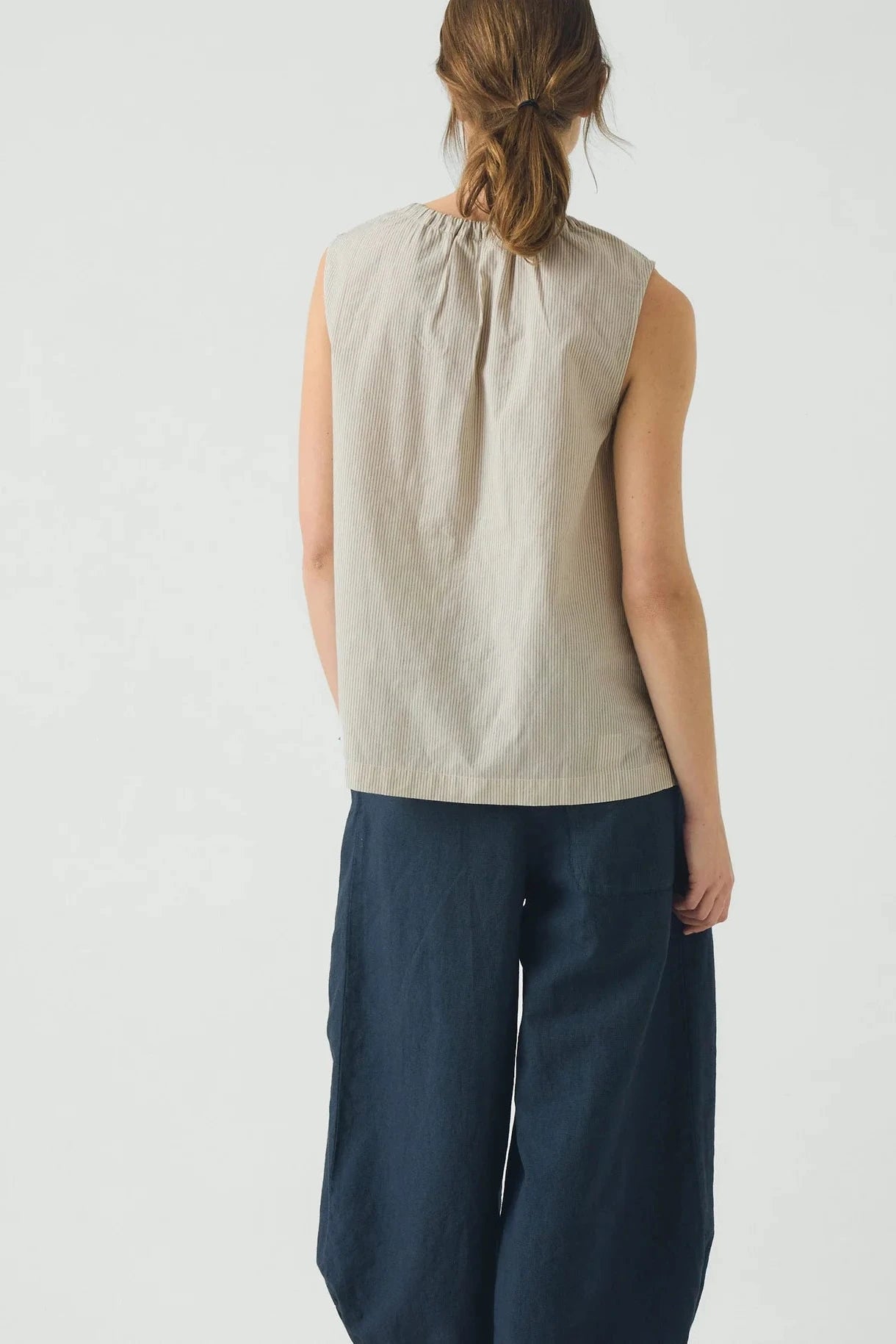 This sleeveless top by TOAST features a tied softly gathered neckline. Made from striped organic cotton crafted to a carefree shape with side hem slits, then finished with corozo buttons.