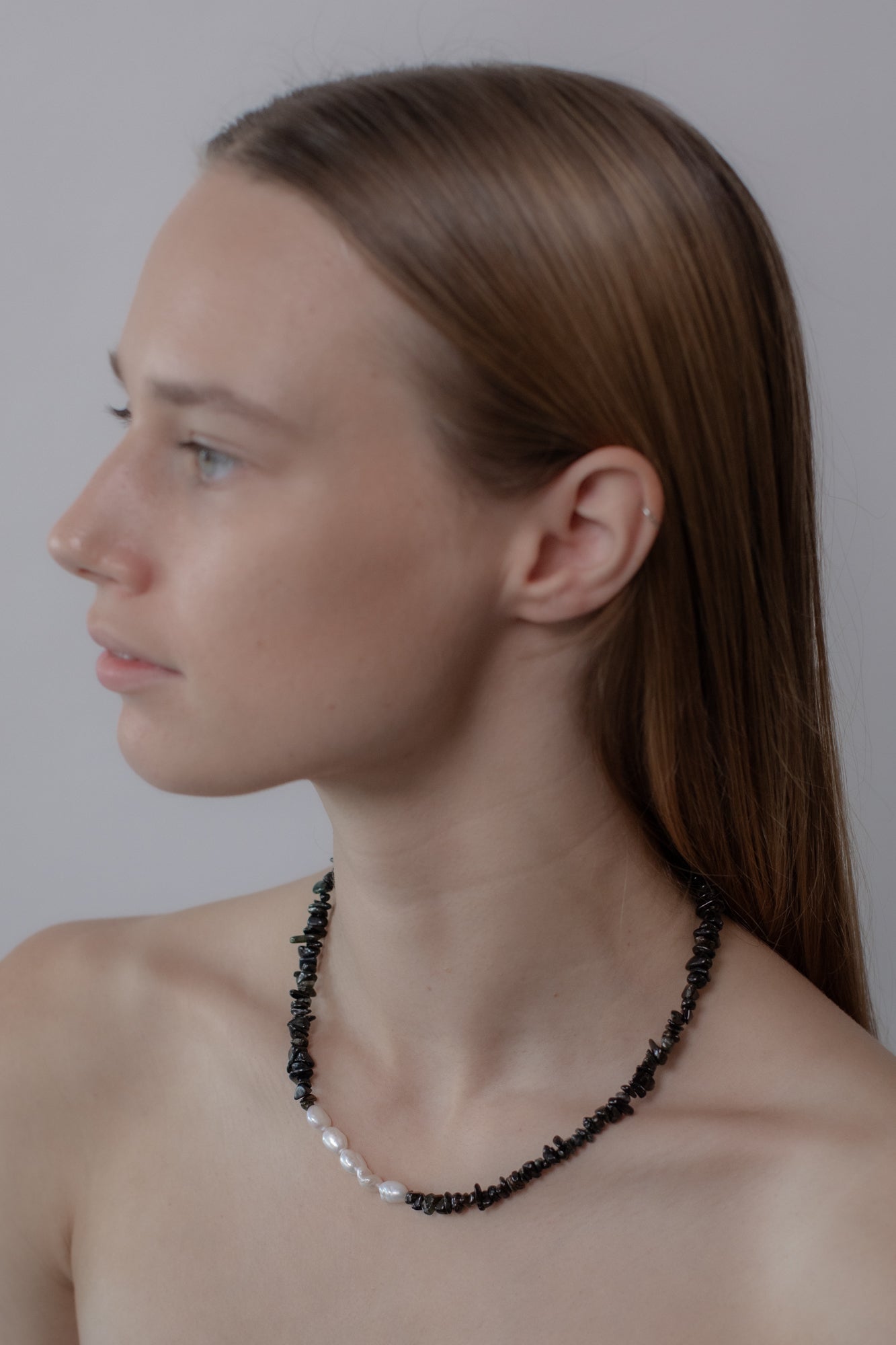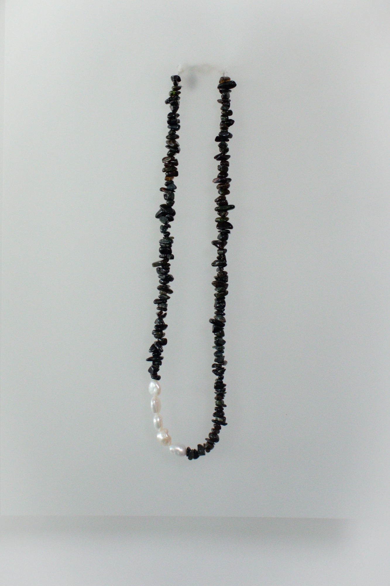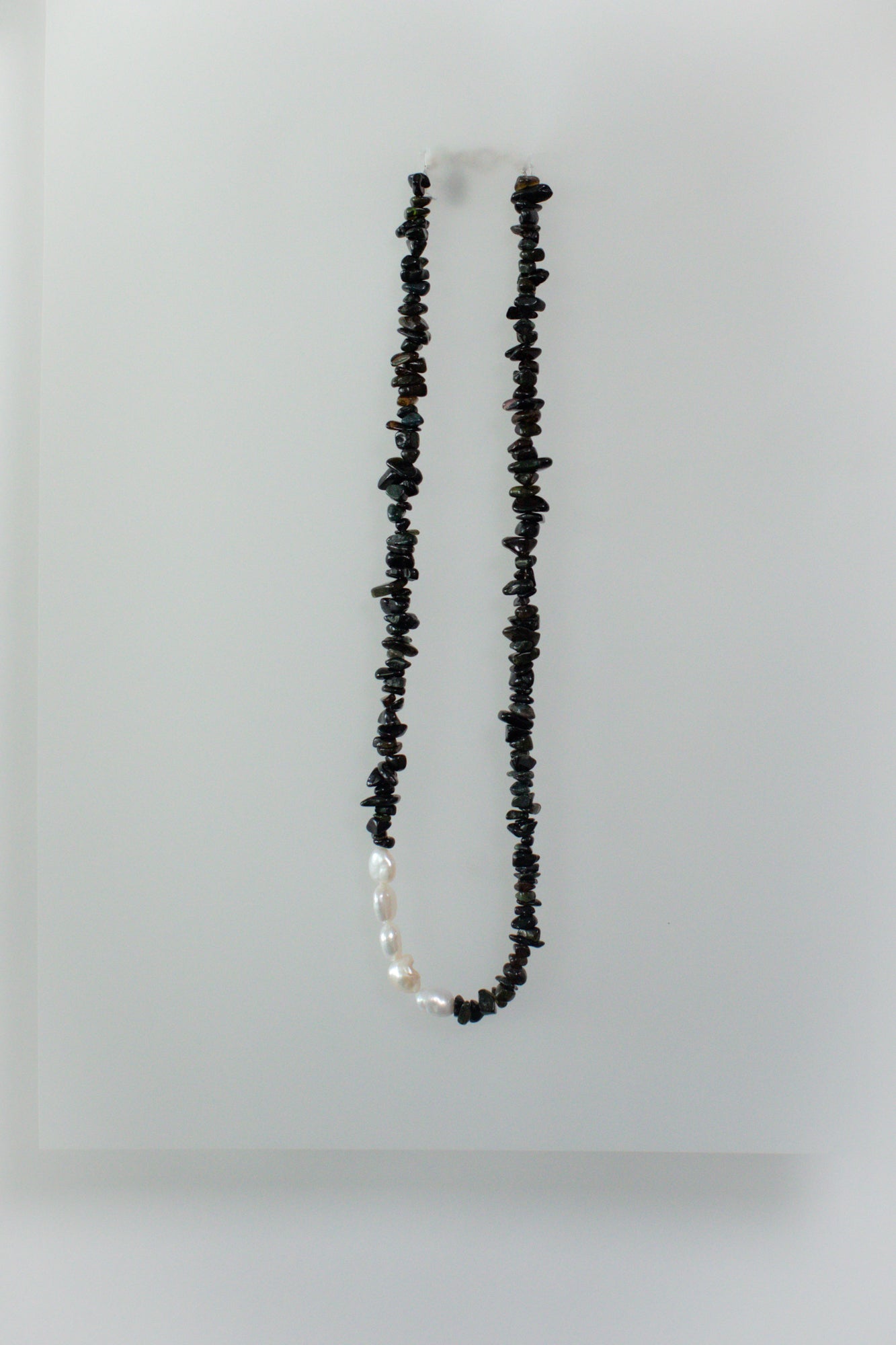 The No. 22 necklace features black tourmaline, a stone for grounding and protection. Contrasting 5 keshi pearls.