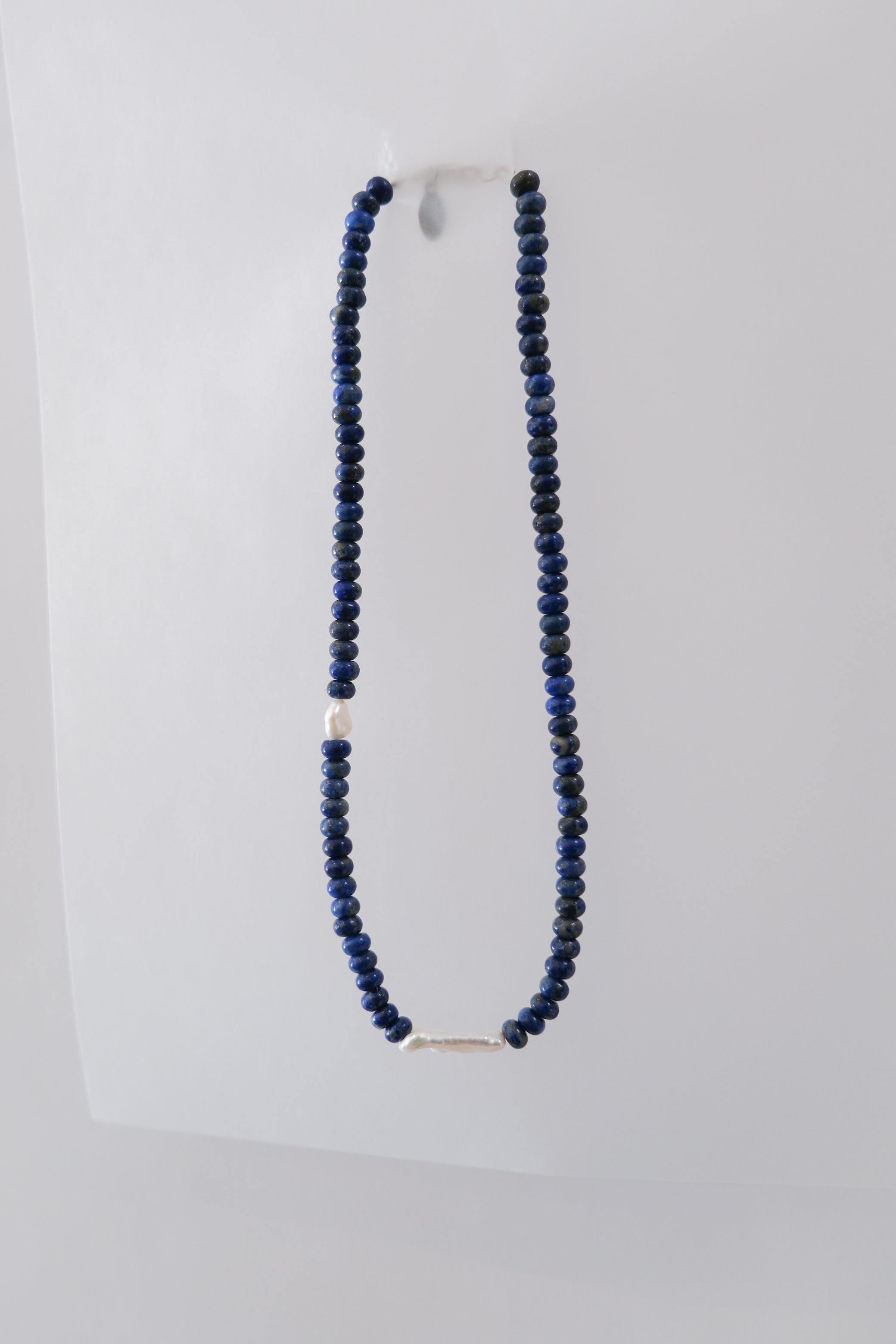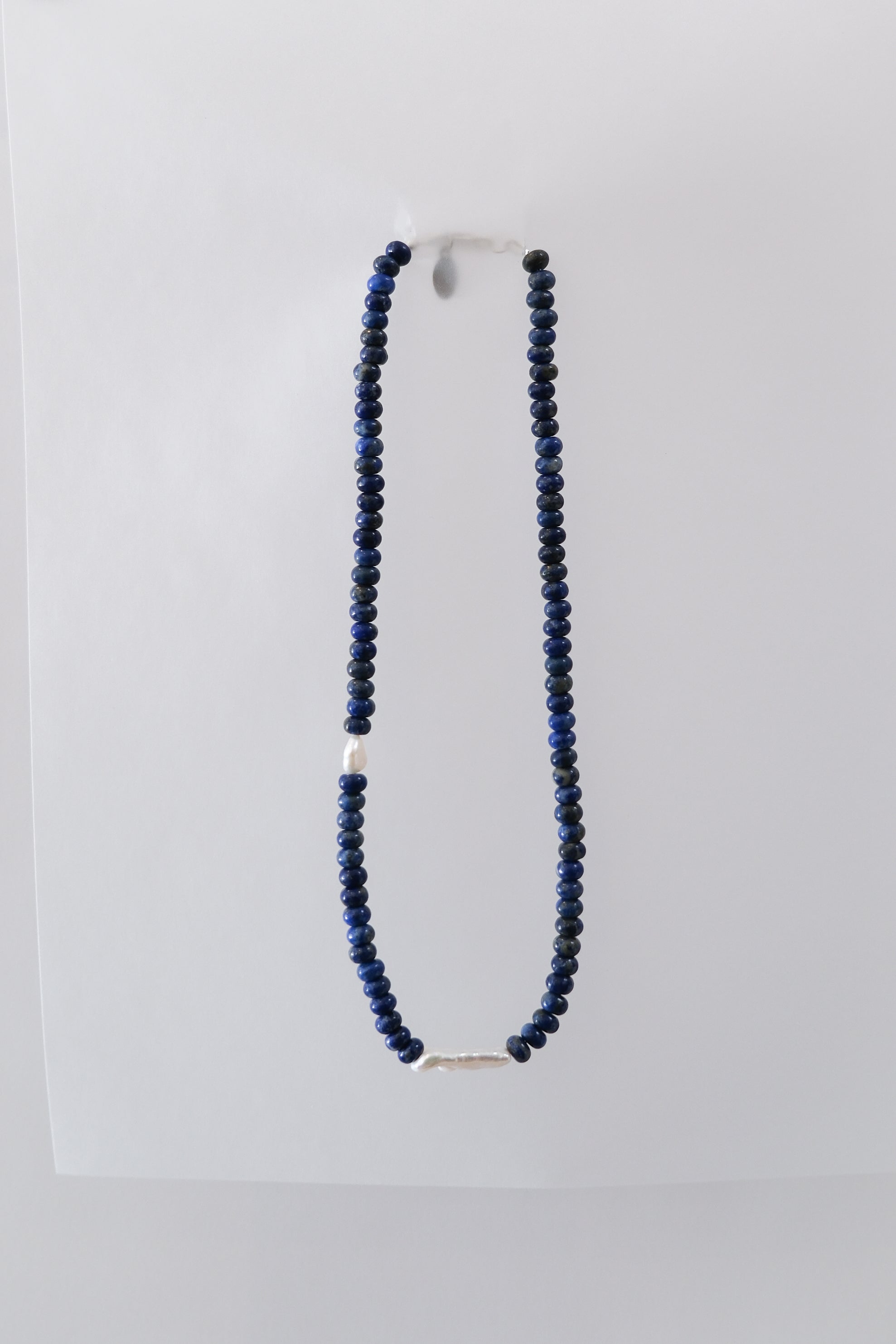 The No. 65 necklace is handcrafted with lapis stones and freshwater pearls.