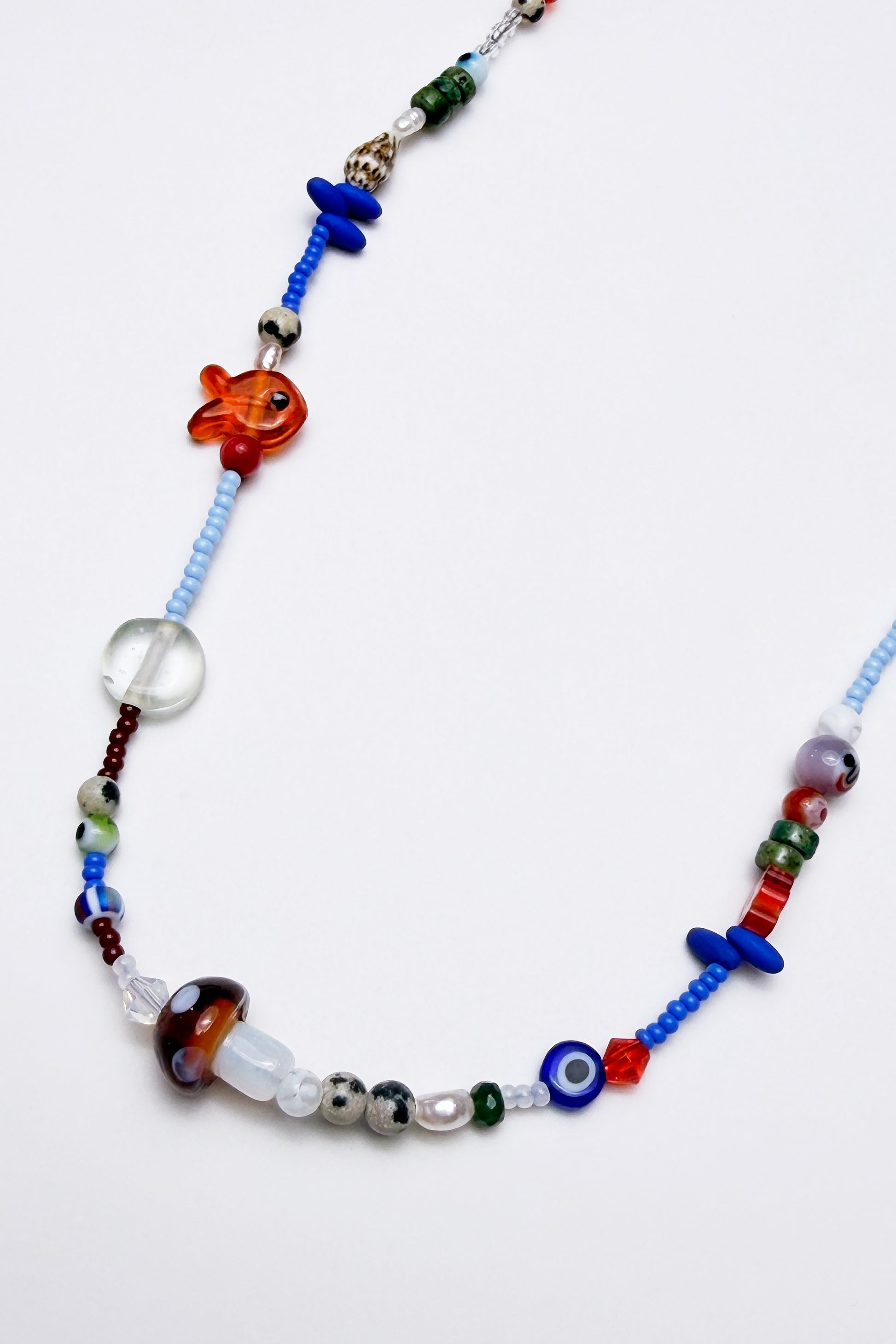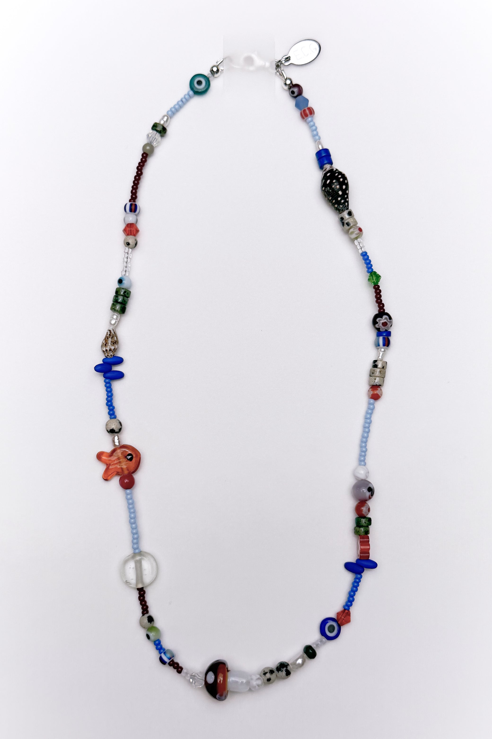 The No. 7 Necklace is a handcrafted piece featuring a considered mix of glasswork beads, pearls, Japanese glass, and natural shells. Each element is thoughtfully arranged and finished with sterling silver hardware for a timeless, elevated touch.