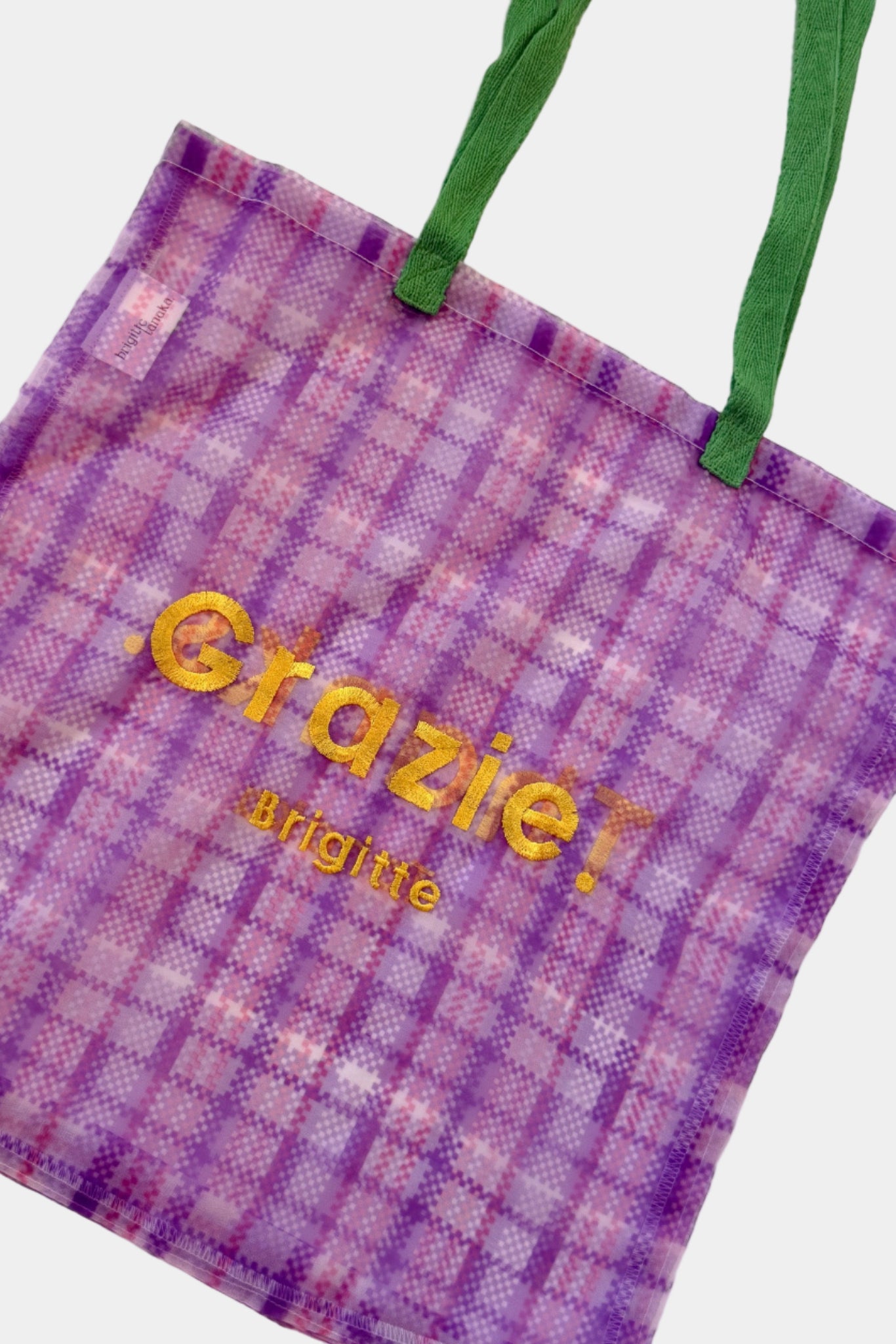 Made from transparent plaid print organza with yellow embroidery and green shoulder straps.