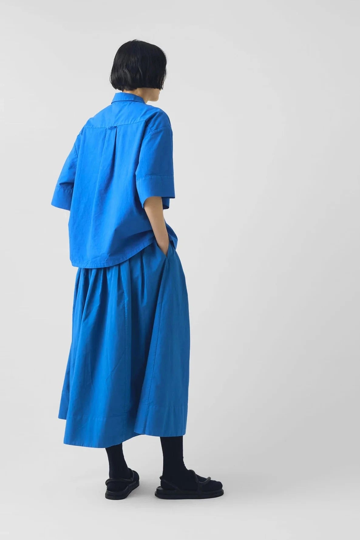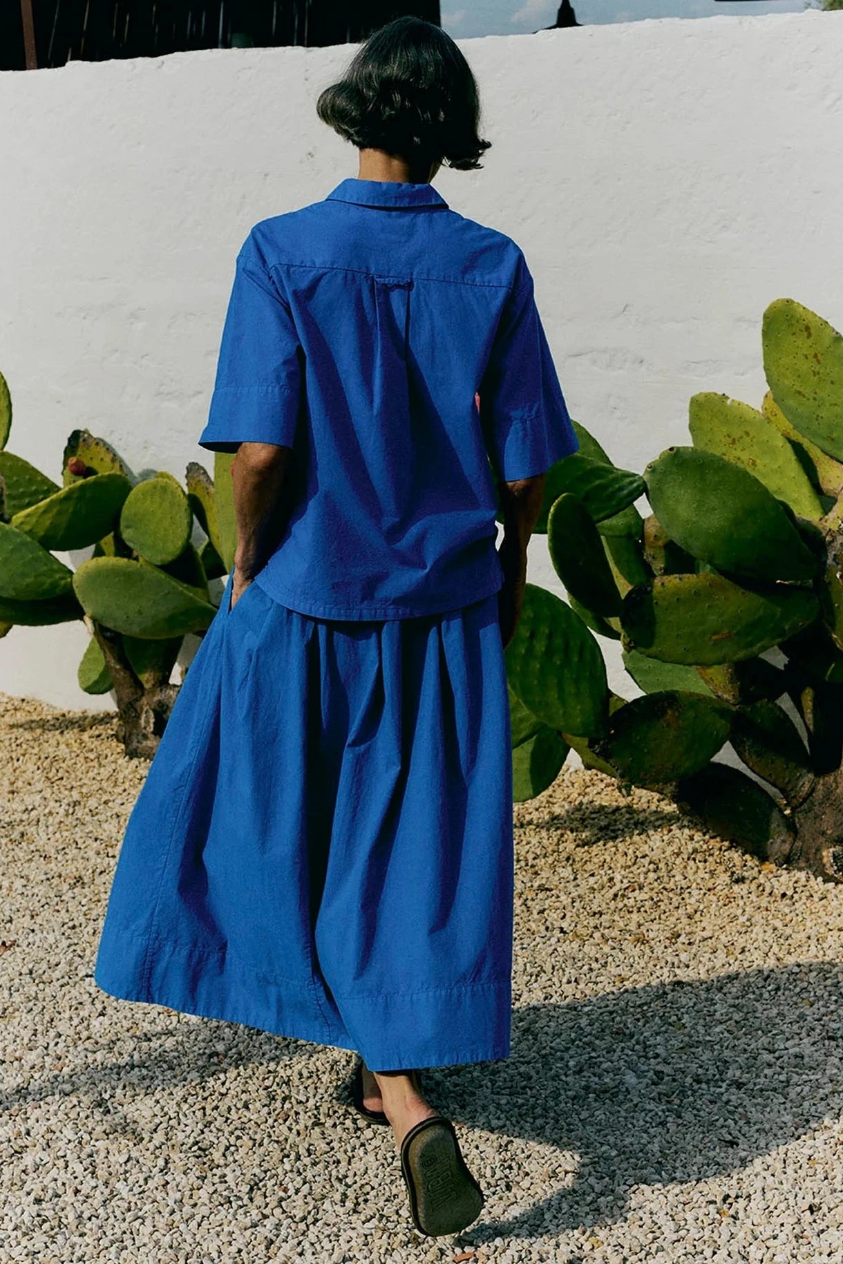 Inverted box pleats bring movement to this Toast poplin skirt, which is garment-dyed for a rich depth of colour. Made from a blend of organic cotton and linen with a back elasticated waist and front adjustable tabs securing with corozo buttons.