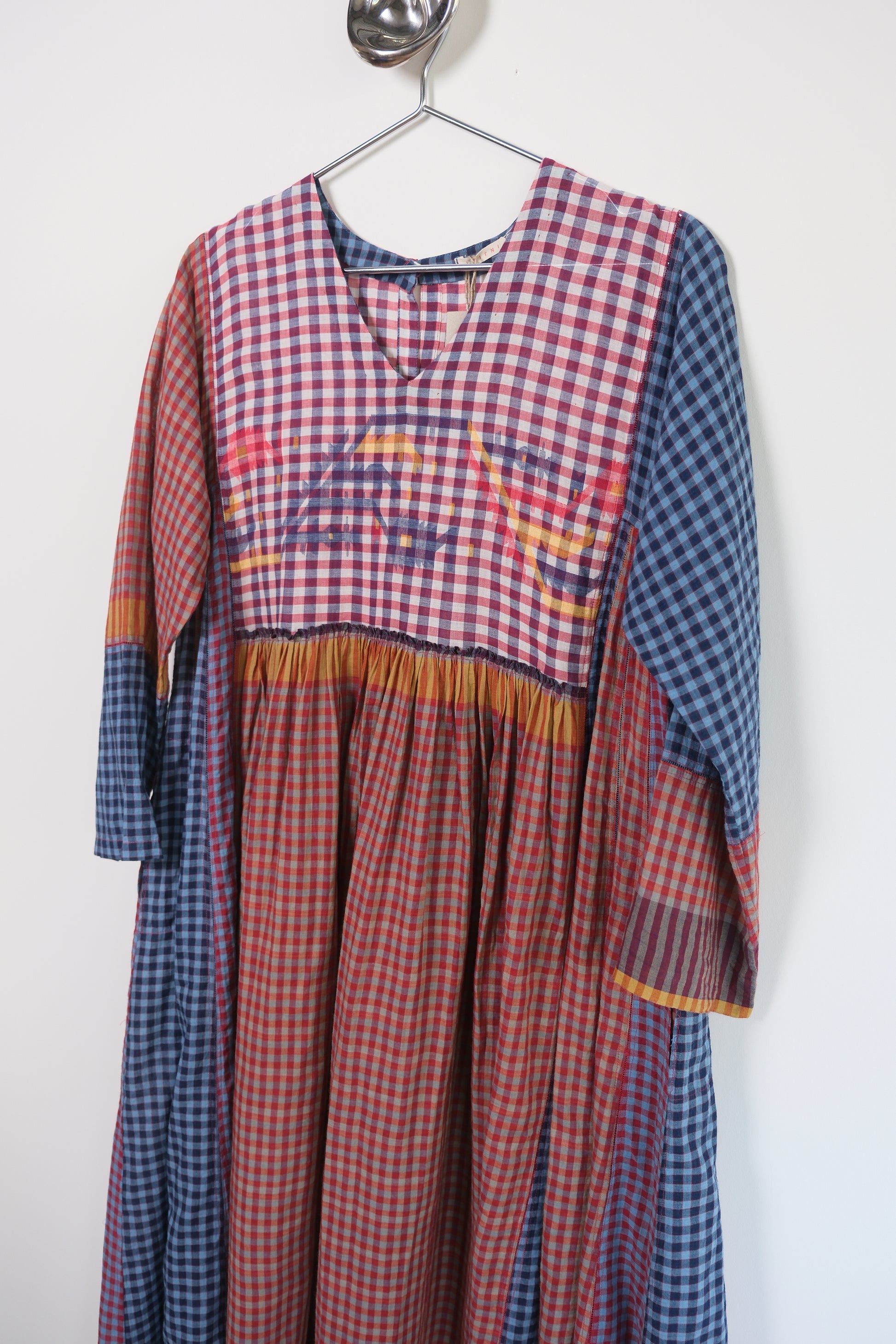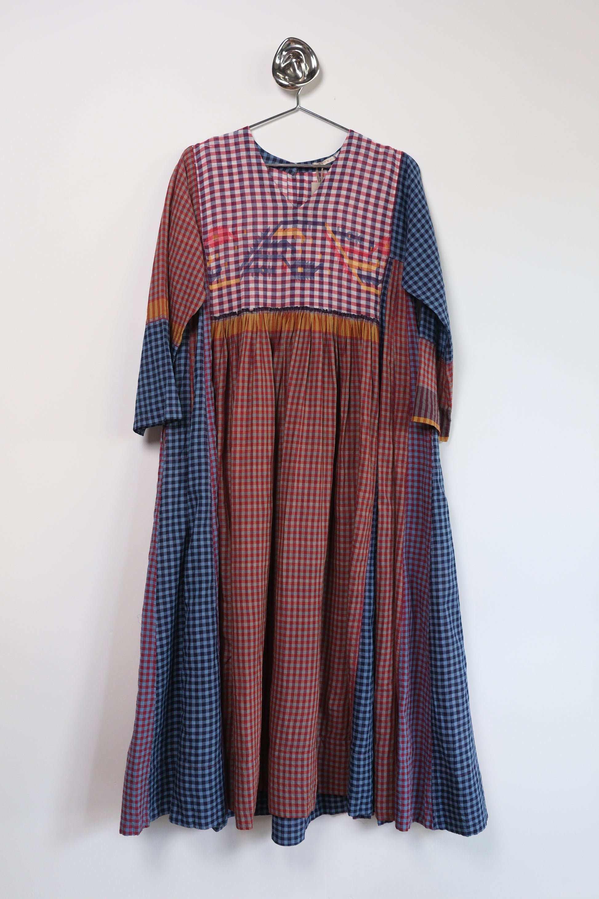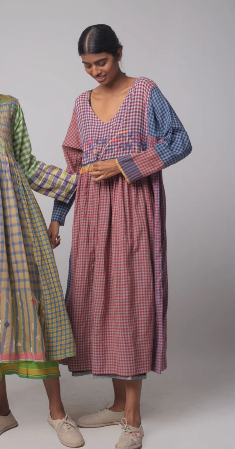 Crafted in 100% cotton this elegant everyday dress, features a shallow v-neck, long sleeve. Crafted in beautiful hand woven patch work style, the sides are constructed with traditional ladder stitch.