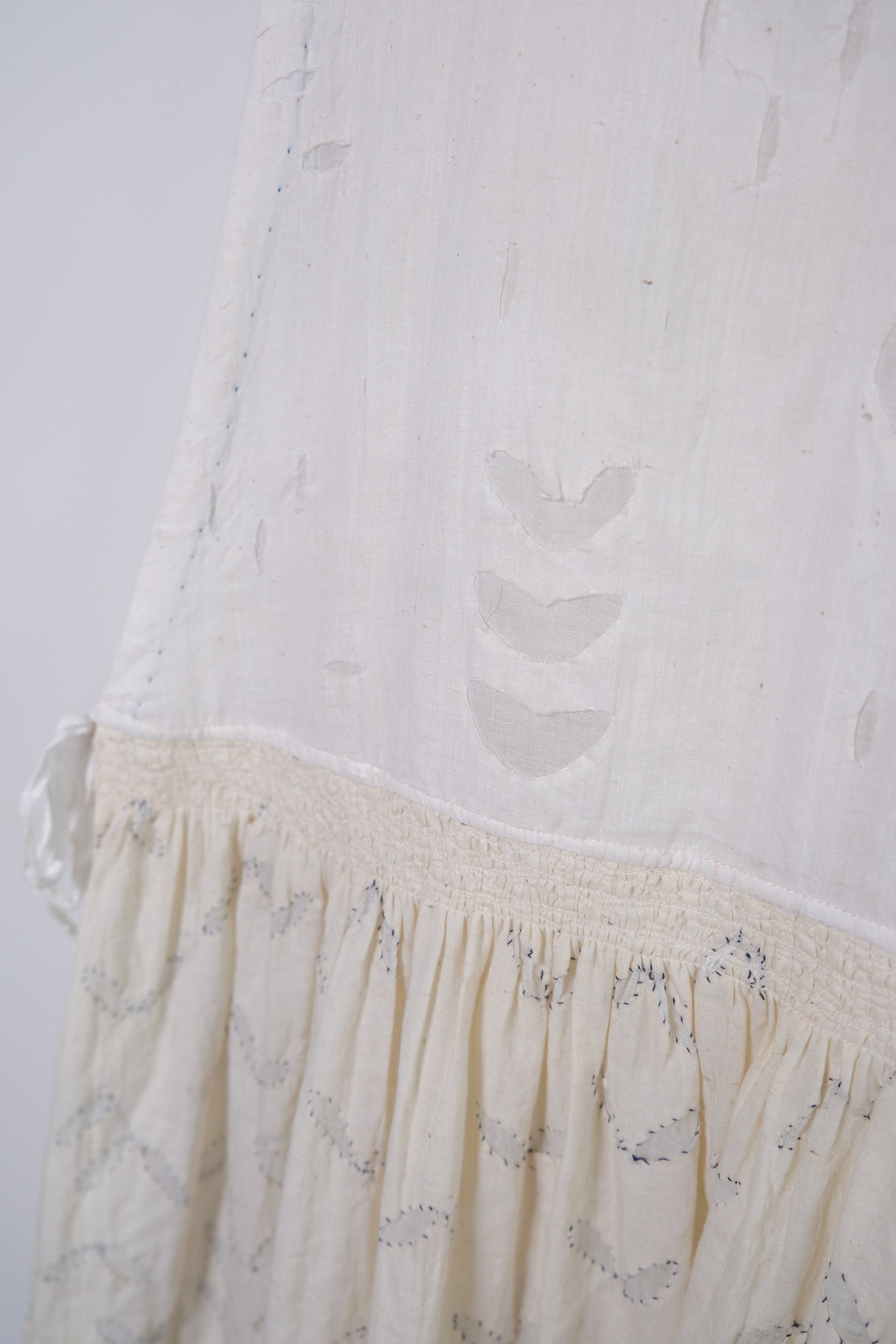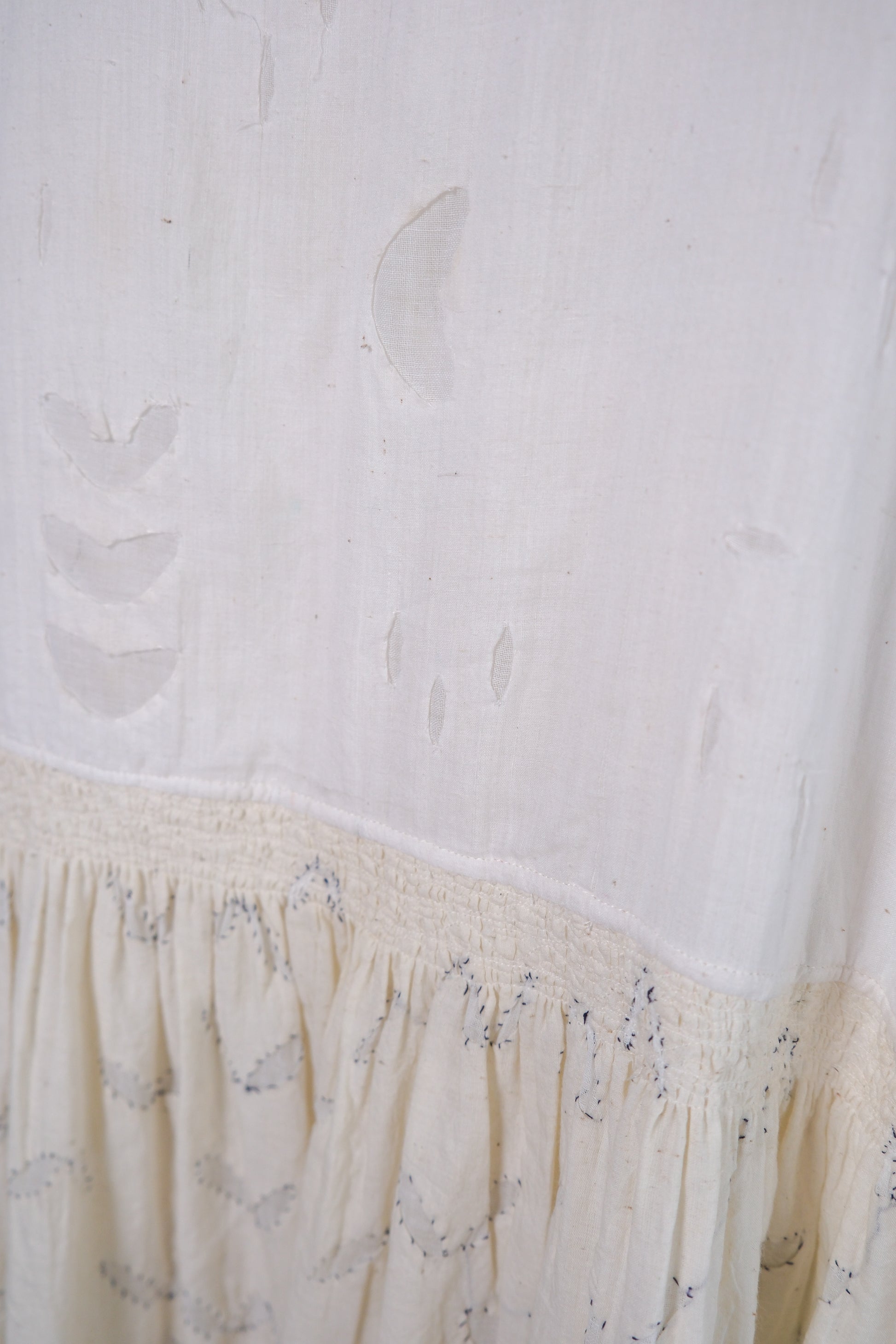This beautiful Injiri tunic dress ties at the waist. Style over slip dresses or jeans. This dress features Barmer appliqué, with white bodice falling into a cream Barmer appliqué bottom.