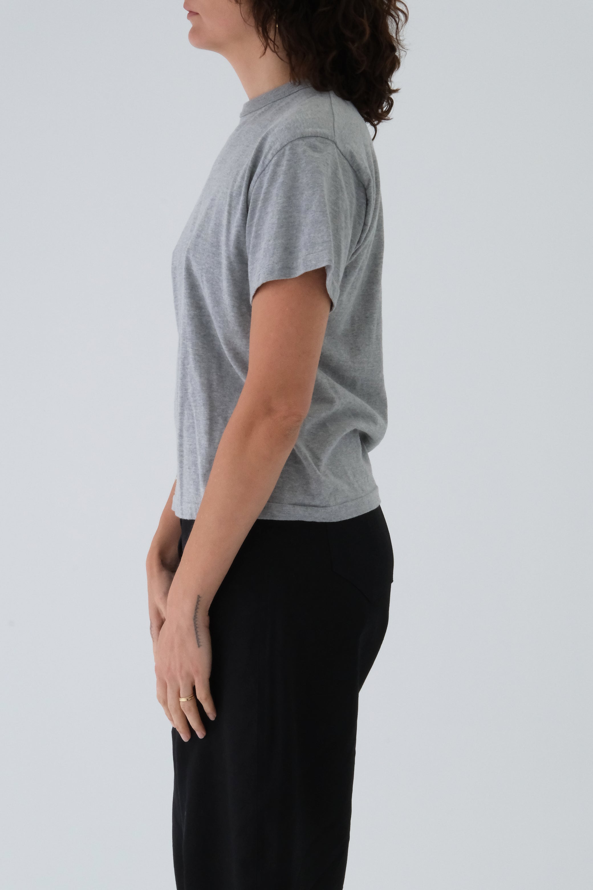 These t-shirts are made on antique circular knitting machine, involving a slow knitting process adding no tension to the yarn, meaning the garment will almost never loose shape. This process also means the tees are produced with no side seams.