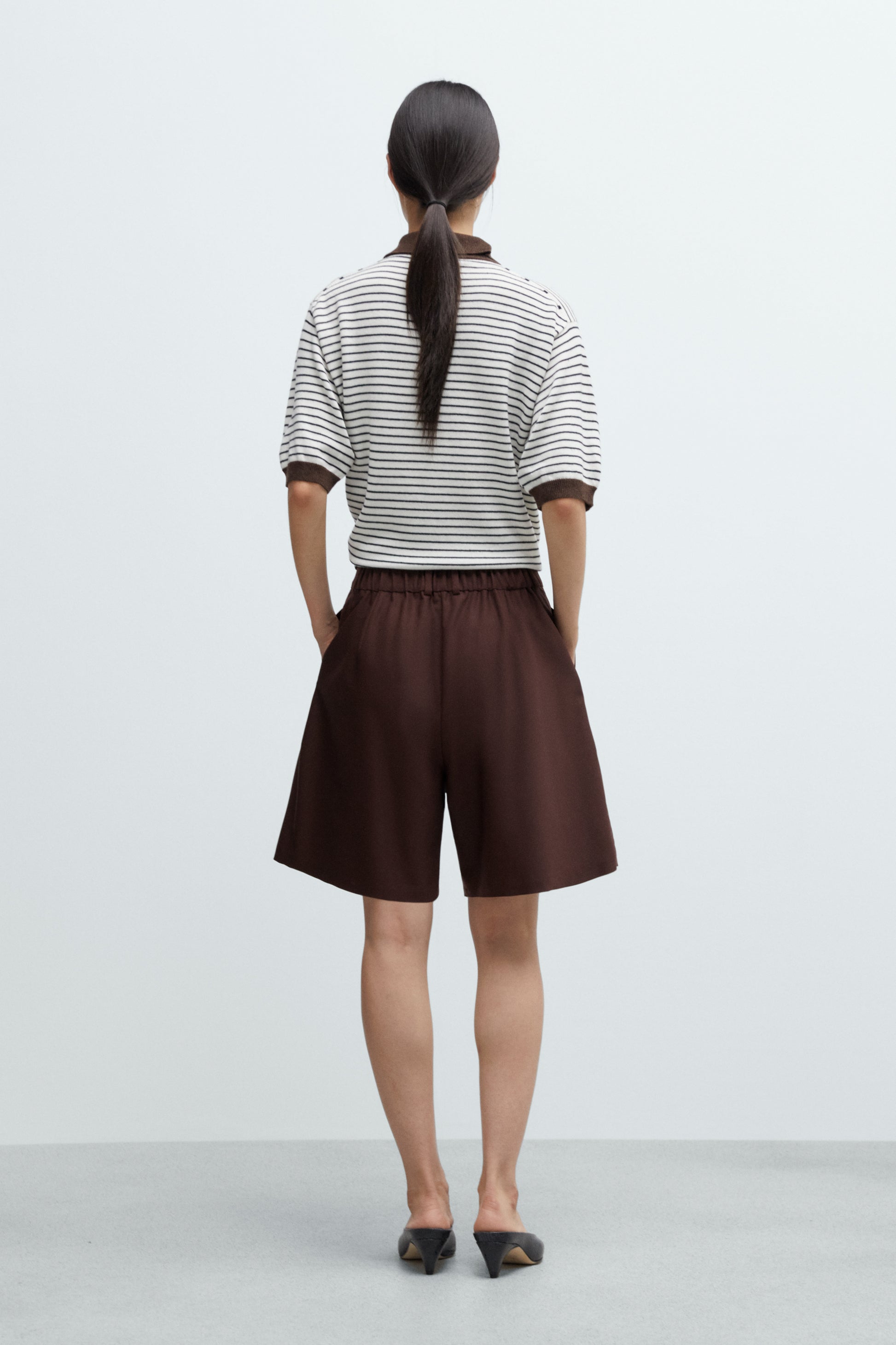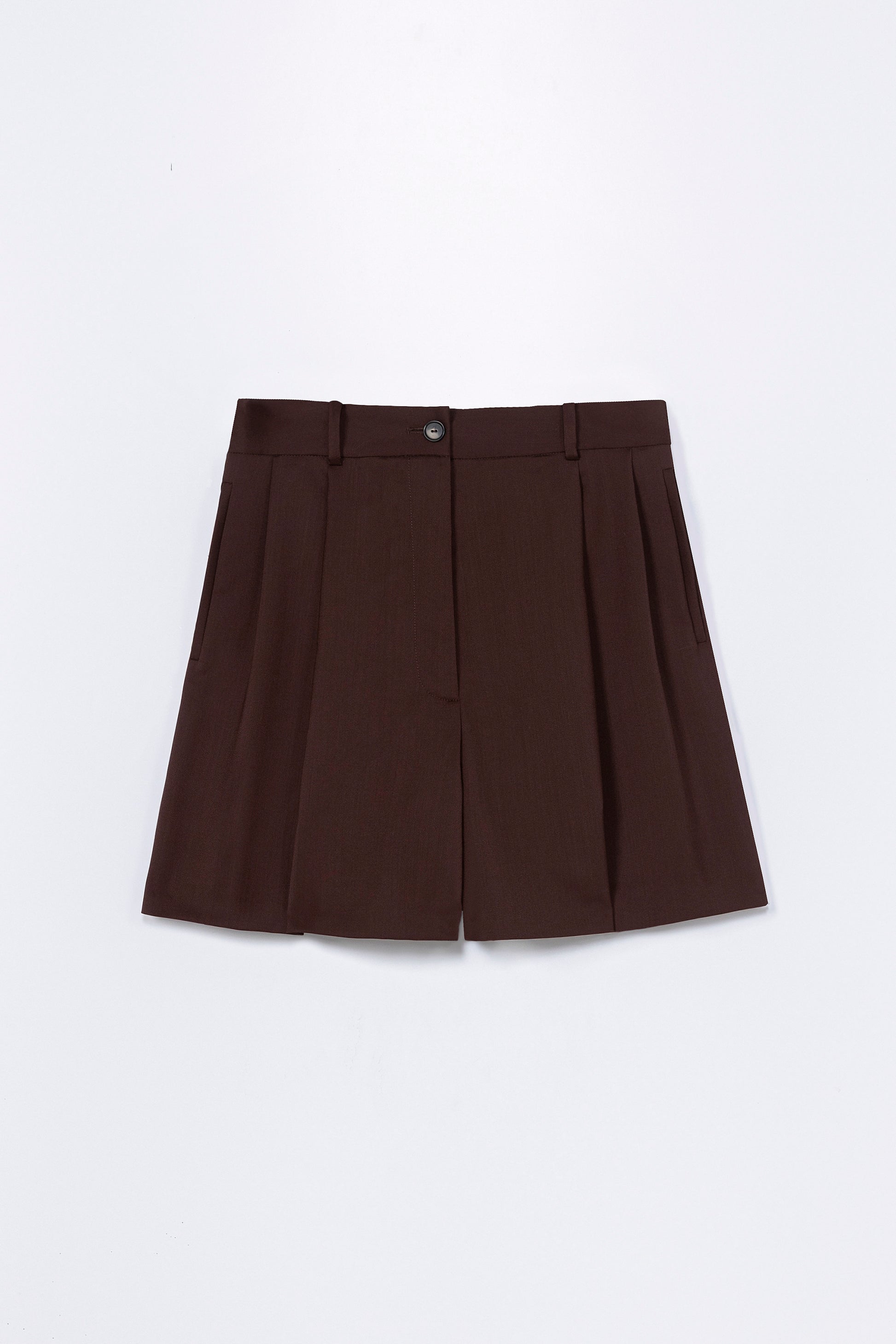 These tailored bermuda shorts feature a classic fit with a double pleat front and a length that sits just above the knee. Designed with belt loops and jetted side pockets, they offer a clean, streamlined look without back pockets. The elasticated waistband at the back ensures comfort, while the front button closure adds a polished finish. A versatile piece that blends modern tailoring with effortless ease.